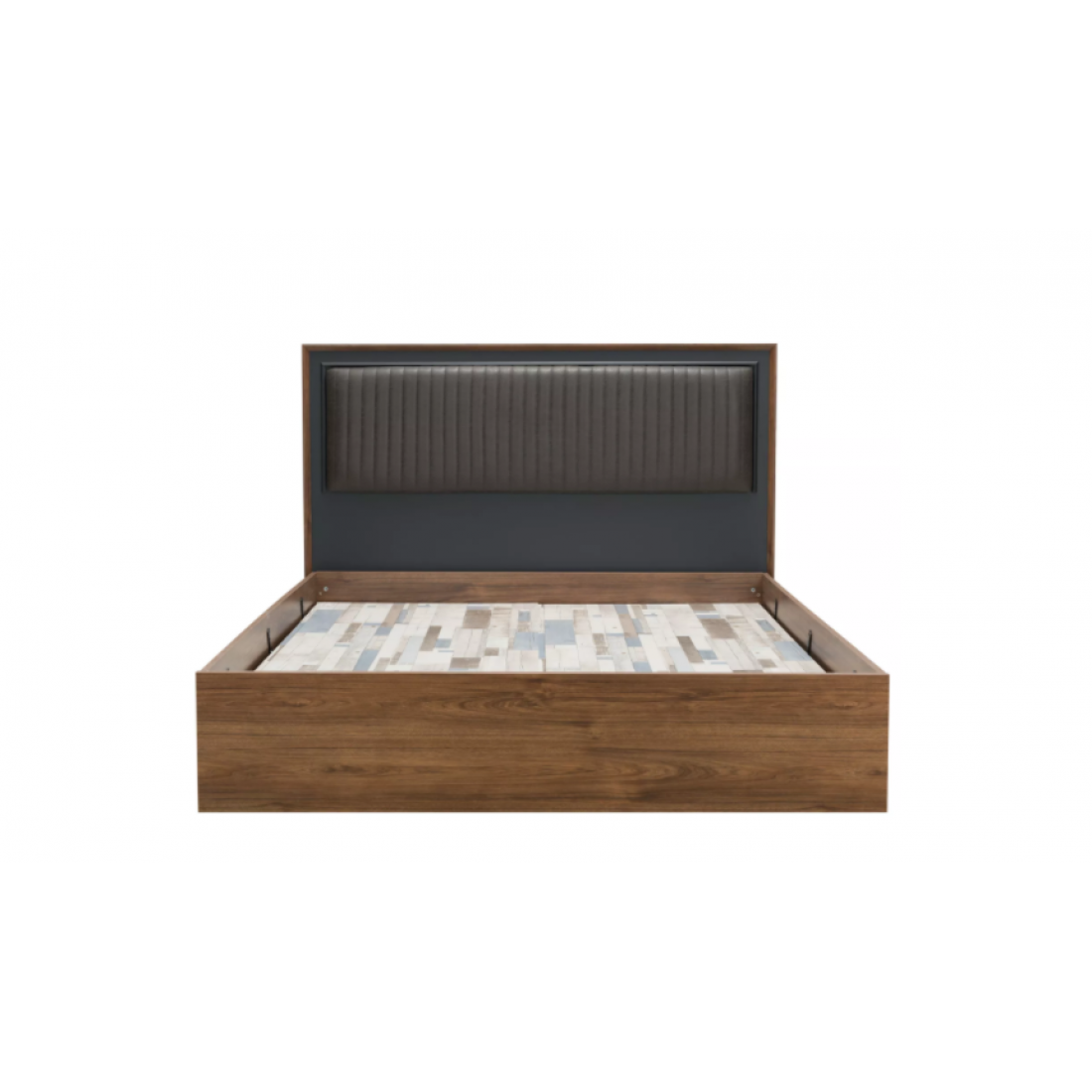 Спинка кровати с деревянной облицовкой и мягкой центральной частью.
