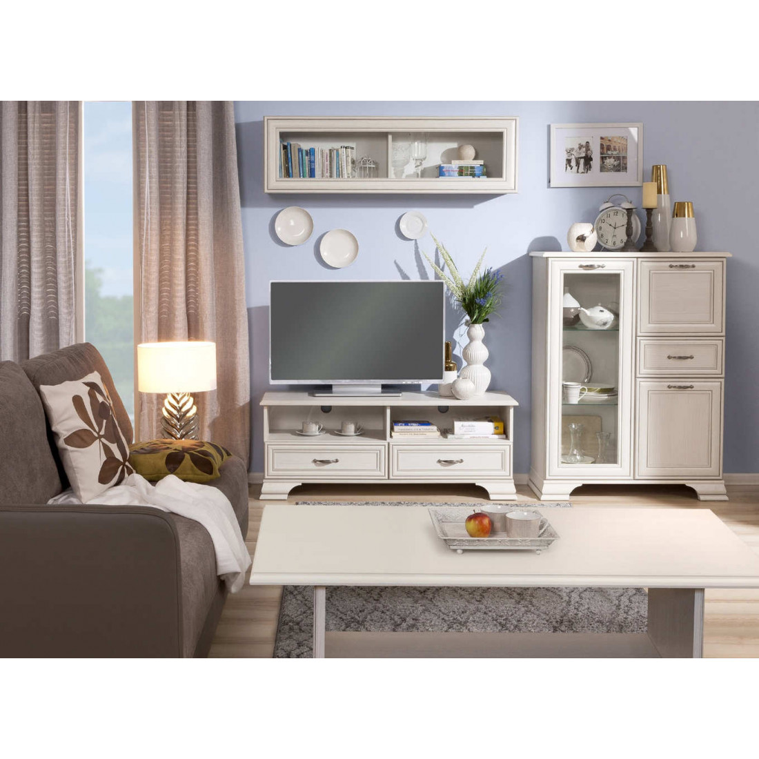 Гостиная Тиффани - это классика, которая всегда остается модной и стильной. Сочетание светлого оттенка с древесной структурой, нежных фасадов, обрамленных изящными планками с патиной и качественных металлических ручек создадут атмосферу тепла и уюта, а возможность использования подсветки делает эту коллекцию особенно привлекательной. Основное достоинство TIFFANY - эстетическая функциональность, которая роскошно дополнит различный по назначению интерьер.