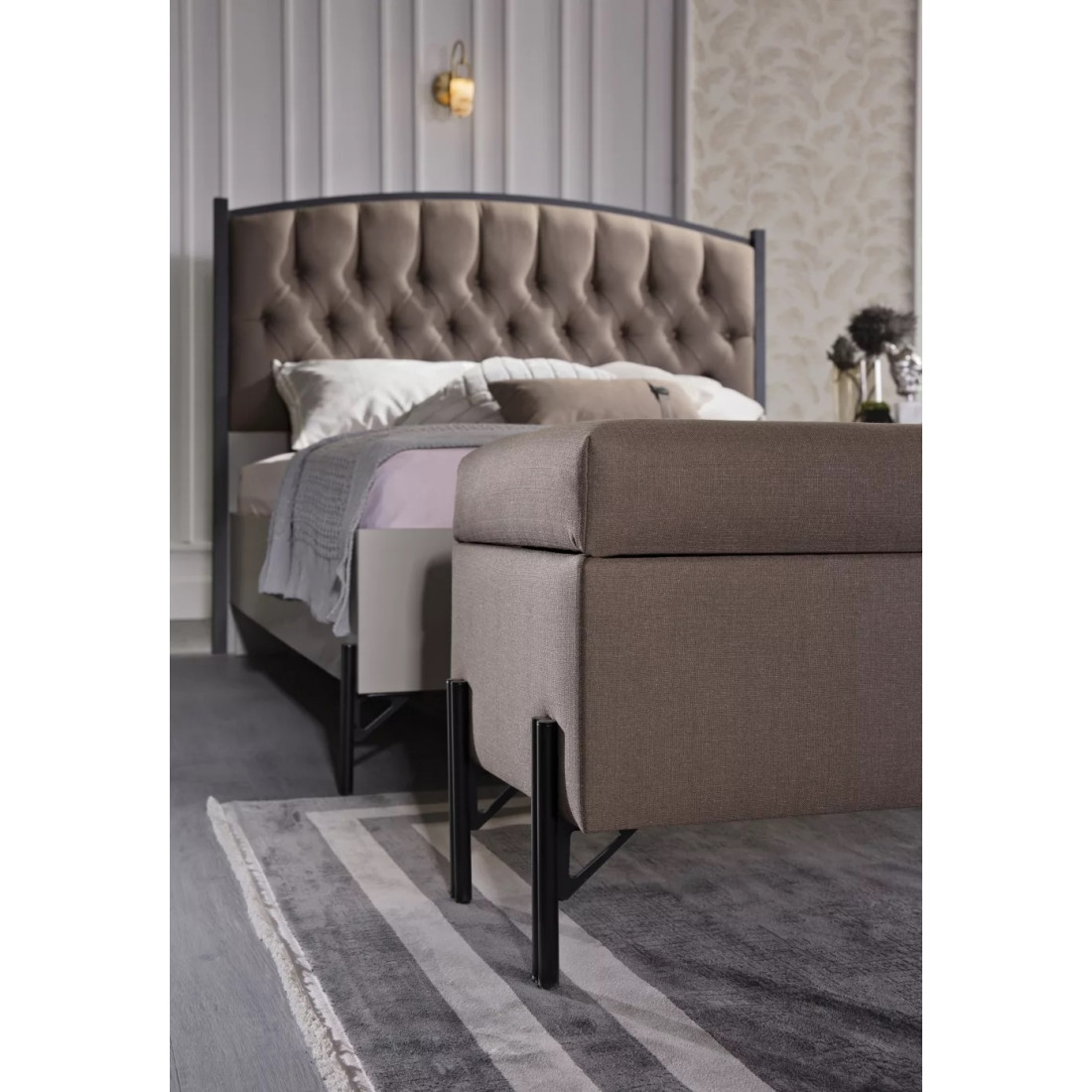 Кровать "Палвин" выполнена в светлых тонах коллекции. Светлое основание с металлическими ножками и мягкой центральной частью на спинке освежат вашу спальню на 100%.