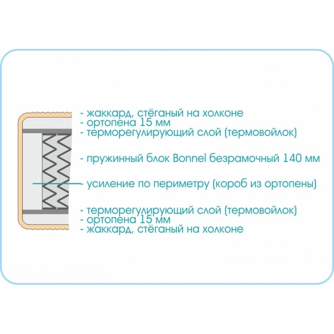 Наполнение: пружинный блок Bonnel безрамочный, высота блока 140 мм, терморегулирующий слой с двух сторон, ортопена 15 мм с двух сторон, усиление по периметру - короб из ортопены.