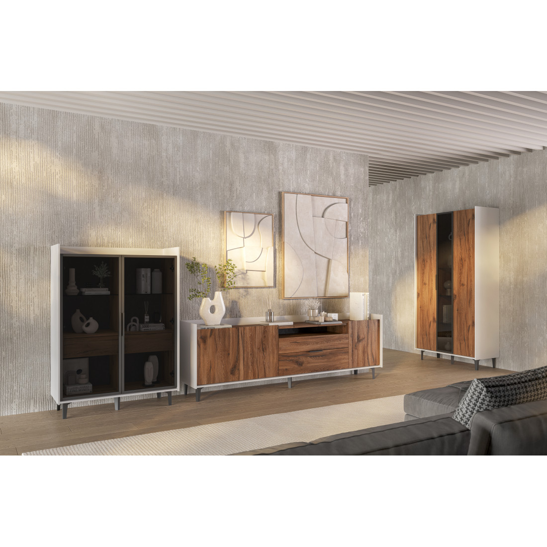 Компактный шкаф Модена представляет уникальное решение для небольших гостиных. Выберите из трех стильных вариантов цветов: Белый-Дуб Элисон, Лунный камень-жемчуг, Металл Бруклин-лунный жемчуг. Металлические ножки гармонично дополняют дизайн, обеспечивая стабильность. Темное стекло придает шкафу загадочность. Два отделения с элегантными стеклянными полками и фасадами создают легкость и визуальное пространство, а между ними расположен удобный ящик для хранения мелочей. Шкаф Модена — идеальное решение для организации пространства в небольших гостиных с учетом стиля и функциональности