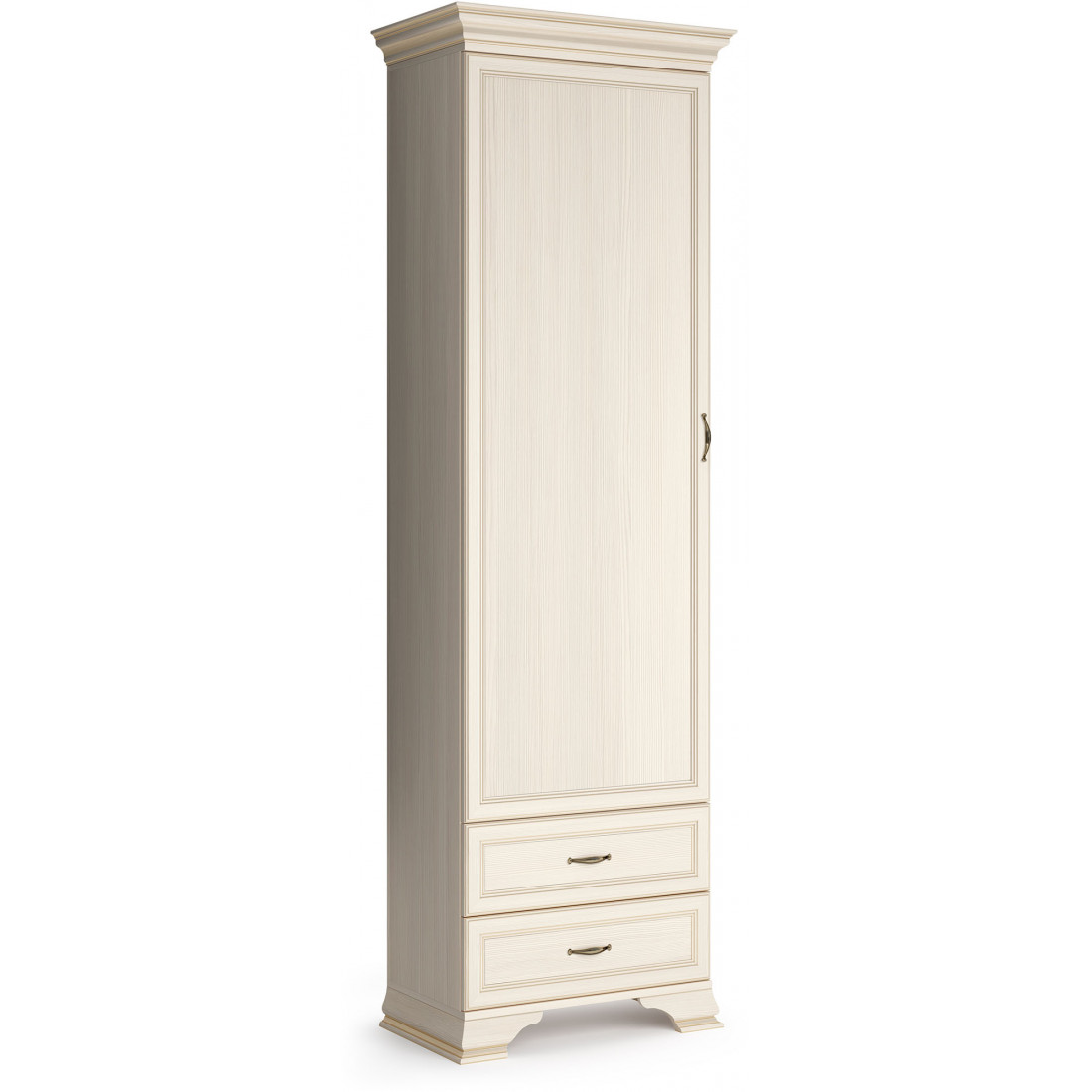 Коллекция производится в текстуре «бодега белый» с эффектом золотого патинирования. Облик «Сиены» дополняют рамочные фасады и карниз в классическом стиле, а также эффектные опоры из МДФ. Мебель комплектуются металлической лицевой фурнитурой премиум-класса в цвете «старая бронза» и надежной крепежной фурнитурой.