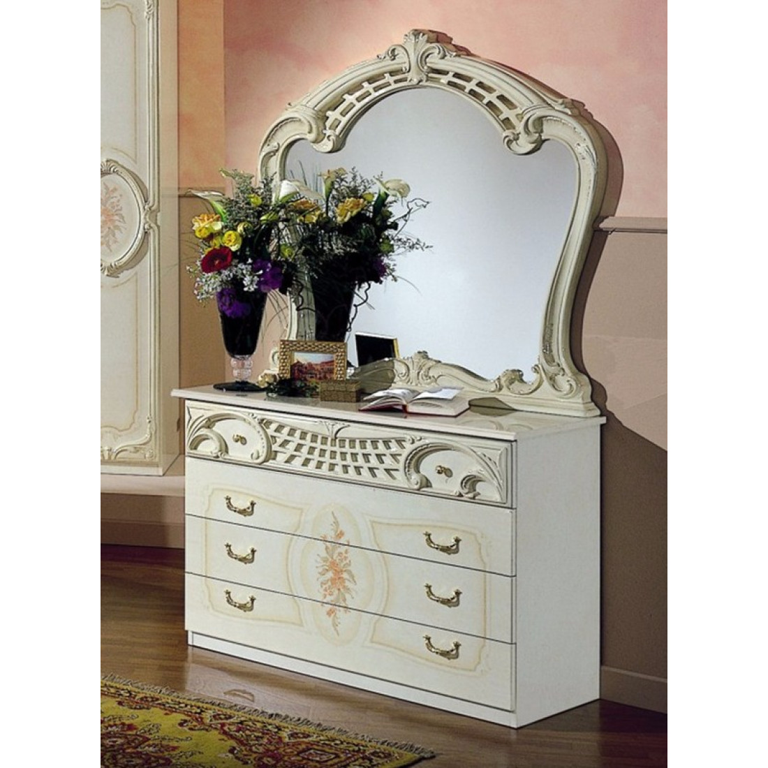 Спальня Роза (беж) от Российской фабрики "ДИА мебель". Выполнена в классическом стиле. Такая спальня коллекции Роза порадует Вас своим дизайном и многофункциональностью. Бежевый цвет в сочетании с глянцевым покрытием и орнаментом на фасадах, придает этой модели еще изысканности и подчеркивает прекрасное чувство стиля своего владельца. Поможет насладиться прекрасным вечером после трудного дня.