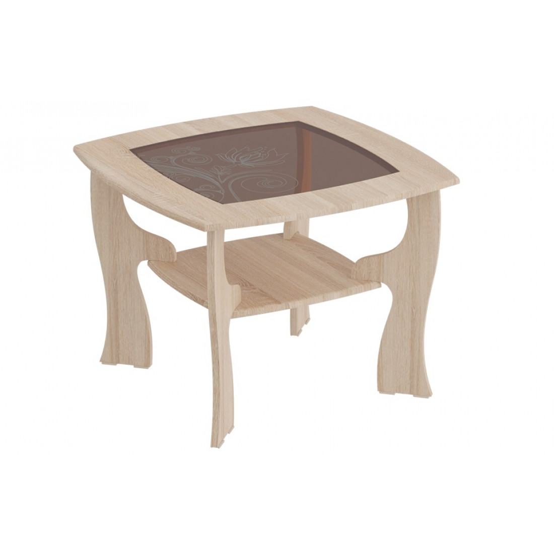 Элегантный журнальный столик в гостиную от фабрики МебельГрад со стеклянной столешницей квадратной формы подойдет для оформления современного или классического интерьера. Стекло столешницы тонированное, декорировано пескоструйным рисунком. Варианты цветового исполнения: Дуб Сонома и Ель Карпатская, или сочетание контрастных Венге Мали и Клен с тиснением.